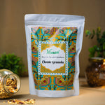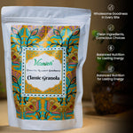 This one’s a comfort classic. A warm, gently spiced blend with tart cranberries, golden and black raisins and the natural sweetness of jaggery and honey. Hints of cinnamon and cardamom add a homely touch, while a sprinkle of pink salt ties everything together. A go-to granola for everyday nourishment with a nostalgic twist.
